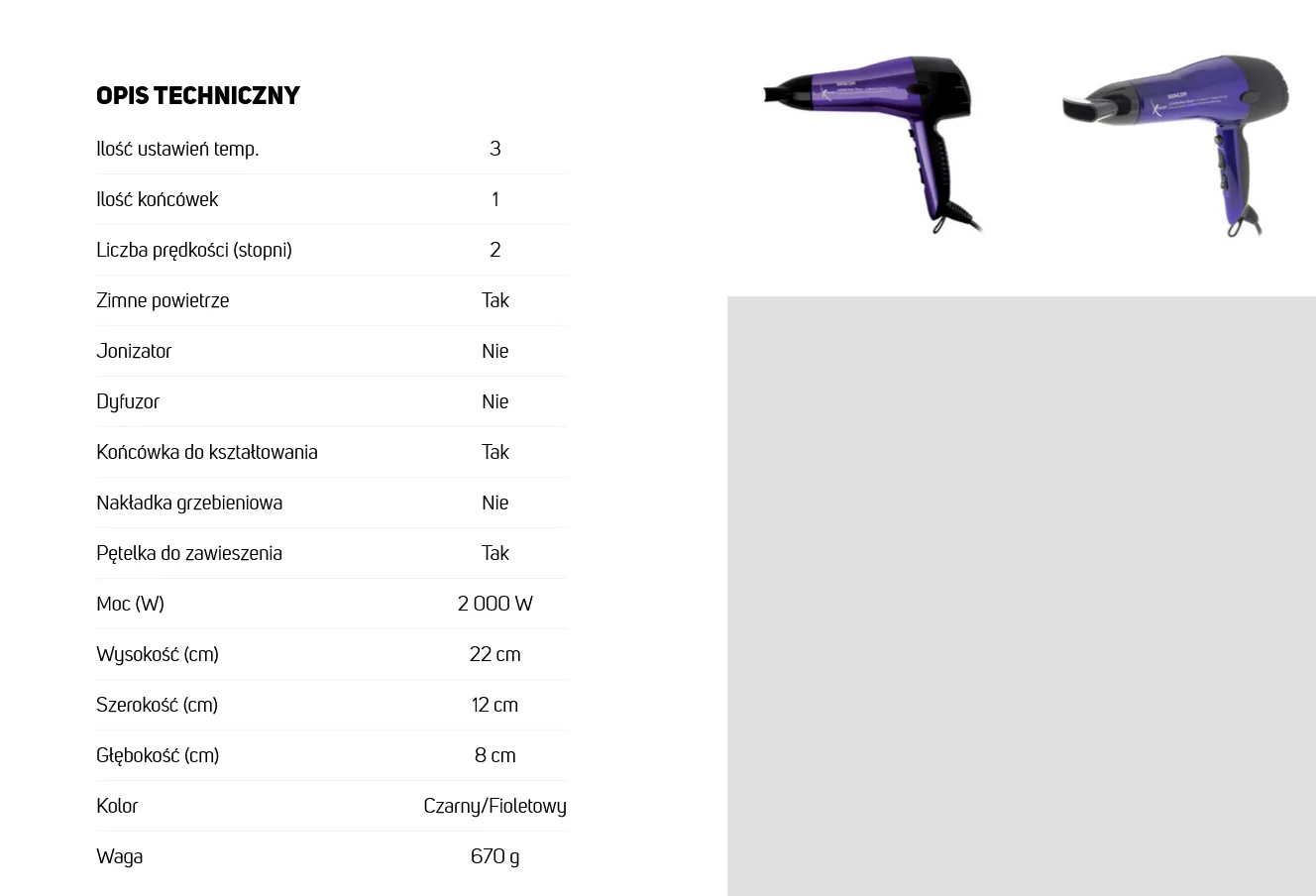 Pozostałe parametry- Bardzo lekka konstrukcja- Ergonomiczna rączka- Dysza powietrzna- Zdejmowana osłona wentylatora ułatwiająca czyszczenie- Tylna część uchwytu pokryta gumą- Wieszak- Gumowane boki obudowy zabezpieczają wentylator przed zadrapaniem przy odkładaniu suszarki- Wyłącznik termiczny zabezpieczający przed przegrzaniem- Napięcie 230 V- Częstotliwość 50 HZ- Klasa ochrony przed porażeniem prądem II- głośność 70 dB