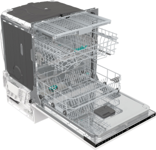 System 3 koszy daje niesamowite możliwości dostosowania do wszystkich potrzeb. Środkowy kosz wyposażony jest w łożyska kulkowe dla zapewnienia cichego i płynnego ruchu. Regulowana wysokość środkowego kosza na 4 cm z regulowanym miejscem na sztućce umożliwia wkładanie i zmywanie naczyń o różnej kondycji i wielkości. System 3 koszy umożliwia jednoczesne zmywanie do 16 sztuk naczyń.